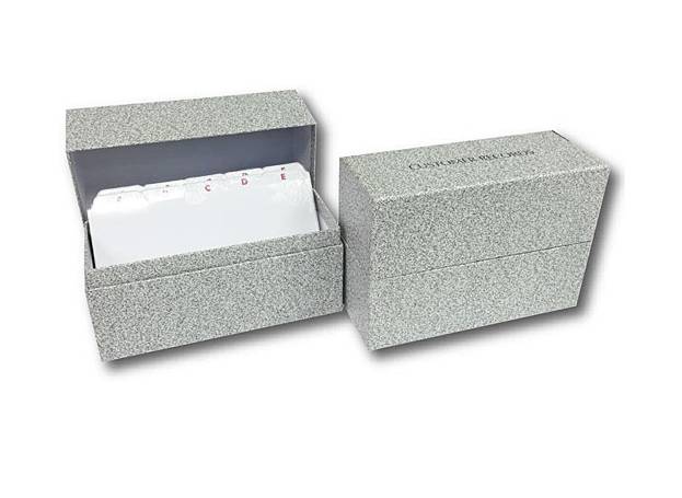 Customer record filing box with space for 200 customer cards.