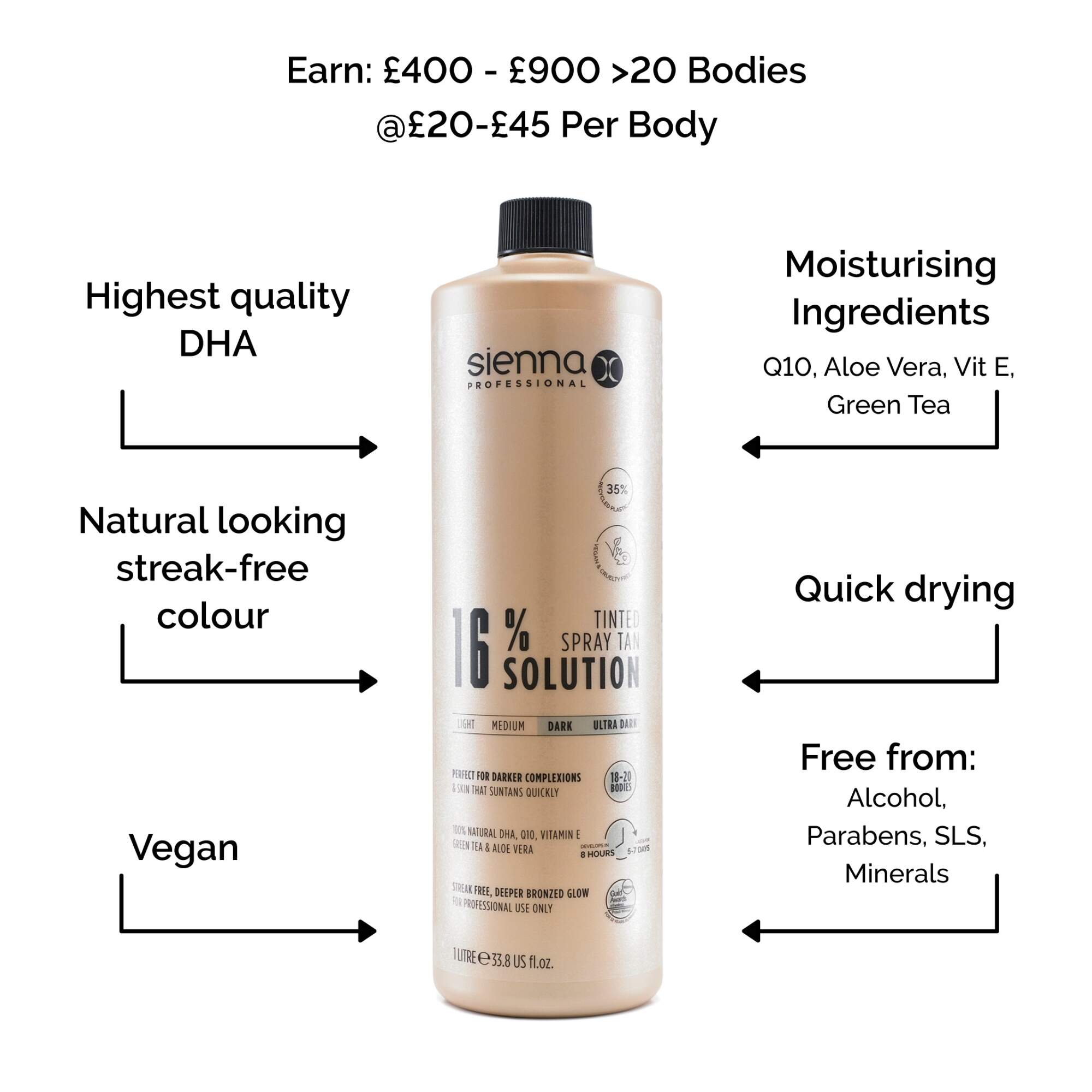 Sienna X's spray tan solution with 16% DHA is the ideal spray tan solution for dark skin tones, as well as clients who need tans for particular events, such as competing bodybuilders or dancers. With high quality, moisturising ingredients, your clients will be left with skin that feels as fantastic as it looks.