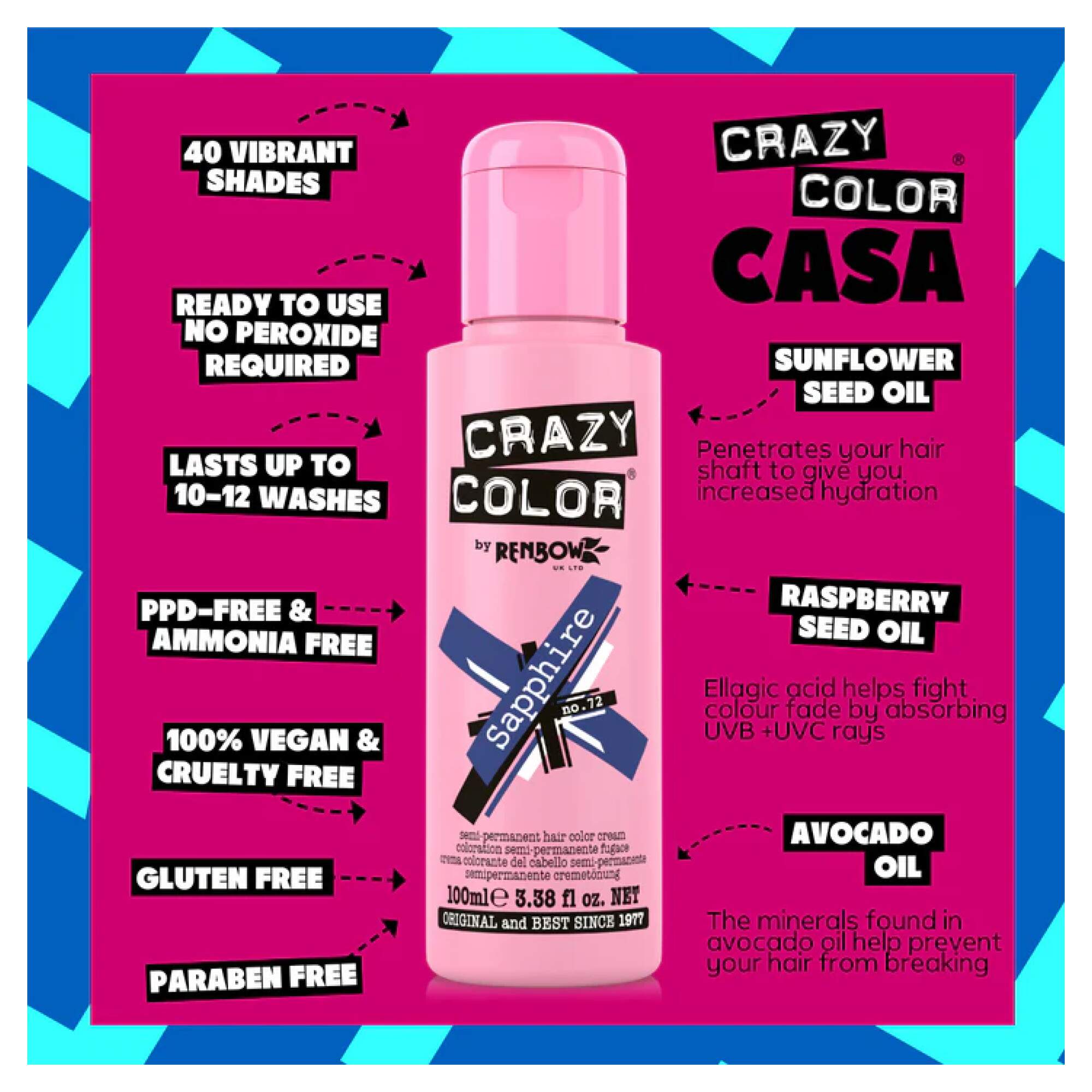 Crazy Color Semi-permanent colour treatments require no ammonia or alcohol and are therefore gentle alternatives to permanent colouring. The lighter your hair, the longer your wear. With 8-12 washes and no colour fade.