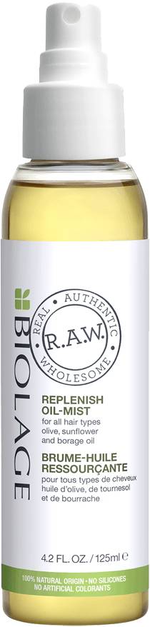 Biolage RAW Replenish Oil Mist is a custom oil blend for all hair types and textures to achieve softer, smoother, shinier hair. A little hair oil goes a long way.