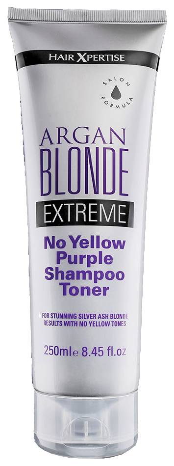 Argan Blonde Extreme Shampoo Toner is a no yellow purple shampoo toner, specially formulated with unique violet pigments and Argan Oil to dramatically reduce yellow tones in ultra-lightened, highlighted and blonde hair.