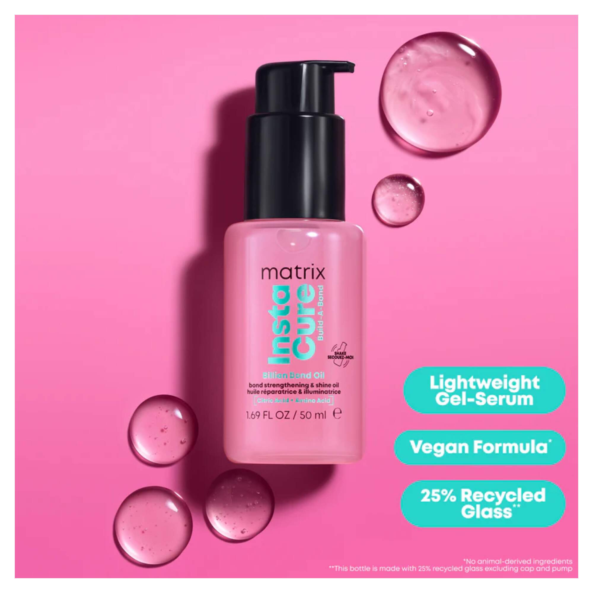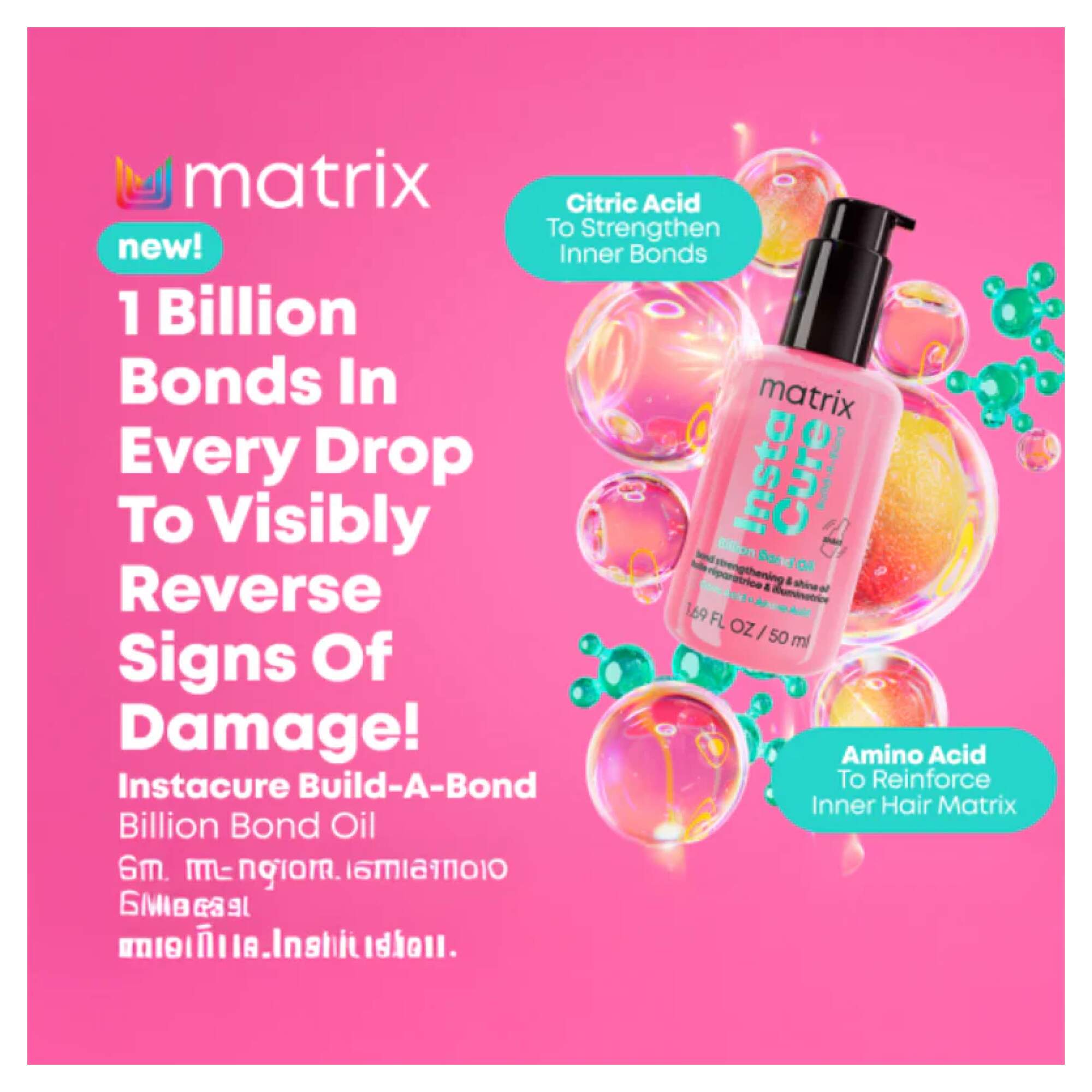 Billion Bond Care for Billion Dollar Hair! Matrix Instacure Build-A-Bond Billion Bond Oil visibly reverses signs of damage with 1 Billion Bonds in every drop. Lightweight gel serum with a vegan formula*, that restores the clean shine to hair with the feel of fresh cut hair. Formulated with 1% Citric Acid to help Strengthen Hair Bonds & formulated with Amino Acids to help Reinforce Inner Hair Matrix.